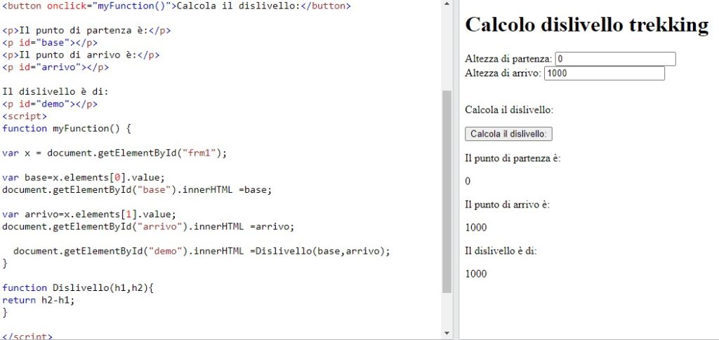 Inserire l’altezza del punto di partenza di un trekking e il suo arrivo (in metri) Con questi dati premendo un bottone scrivere i dati nella pagina e calcolare con una funzione il dislivello totale.